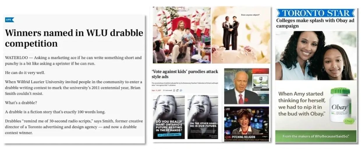 Brian not only appreciates the need for authors to promote their own work but also has the skills to do so for himself with great effectiveness. Having been ranked among Canada's Top 10 copywriters by Strategy Magazine, his multimedia campaigns have generated millions of dollars in free media coverage by CNN, the New York Times, BBC, CBC, CTV, Global National News, hundreds of online media outlets, and a front-page article in the Globe and Mail. Several of his campaigns – including what one national newspaper called a 'brilliantly subversive' campaign for Colleges Ontario in which he invented a fake prescription drug called Obay – appeared as case studies in marketing textbooks.